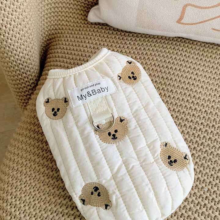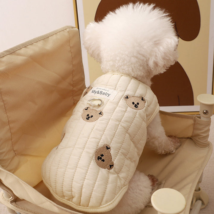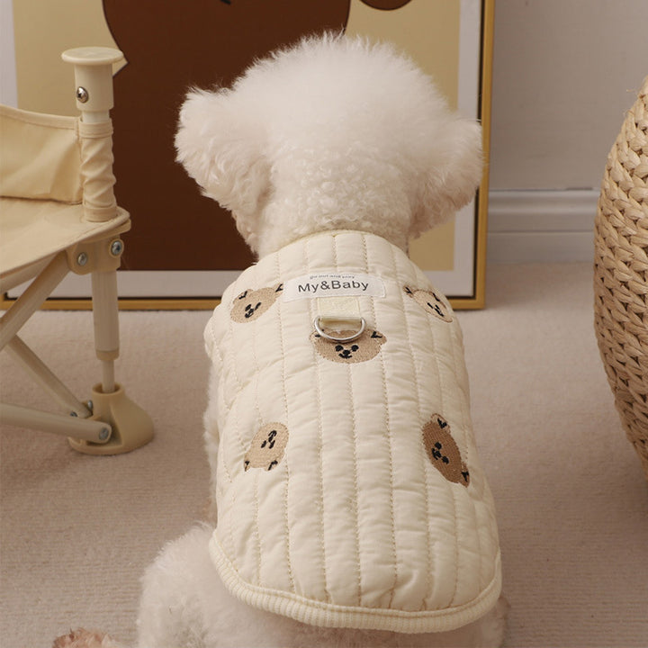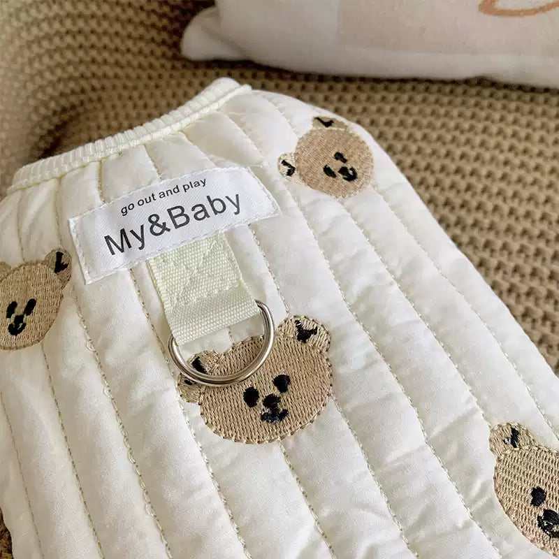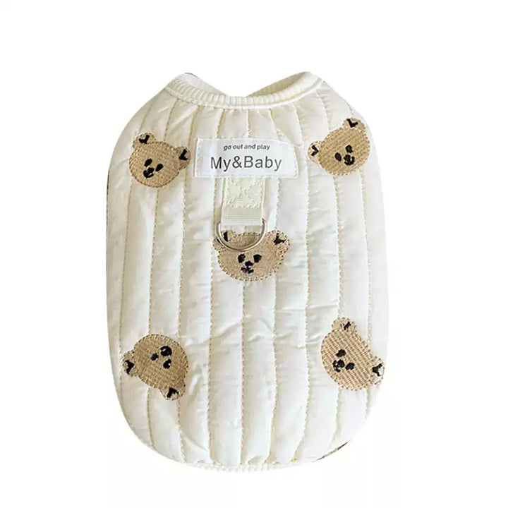 This pet clothing is designed for small dogs and cats, suitable for autumn and winter. With this adorable pet jacket, even the chilliest weather becomes a walk in the park! The bear print design offers a simple yet stylish look, featuring a three-button closure and sleeveless armholes for a snug, cuddly fit. The clothing includes practical features such as D-rings and buttons, ensuring comfort and security for pets like Teddy, Bichon, Pomeranian, Yorkshire, and cats during the colder months.