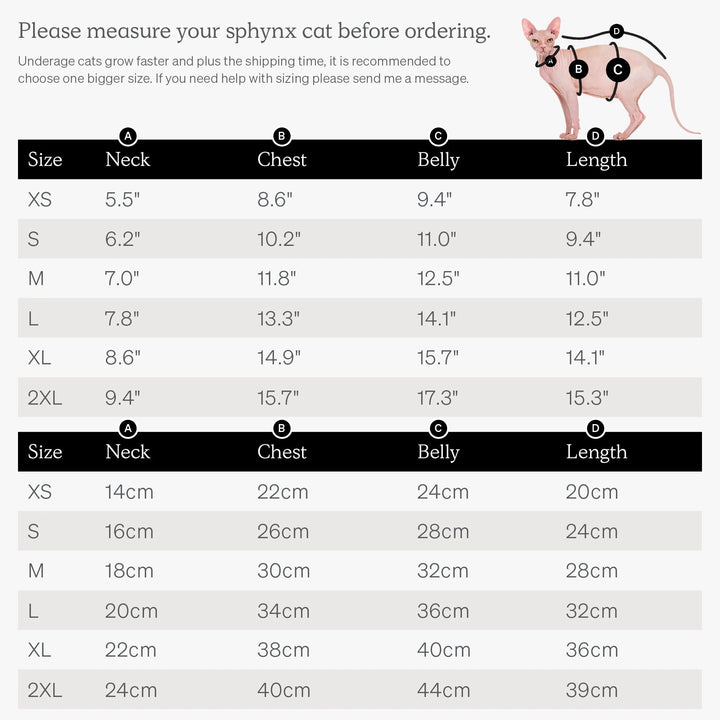 PLEASE MEASURE YOUR SPHYNX’S CHEST GIRTH, BACK LENGTH, NECK GIRTH & BELLY GIRTH BEFORE ORDERING.
