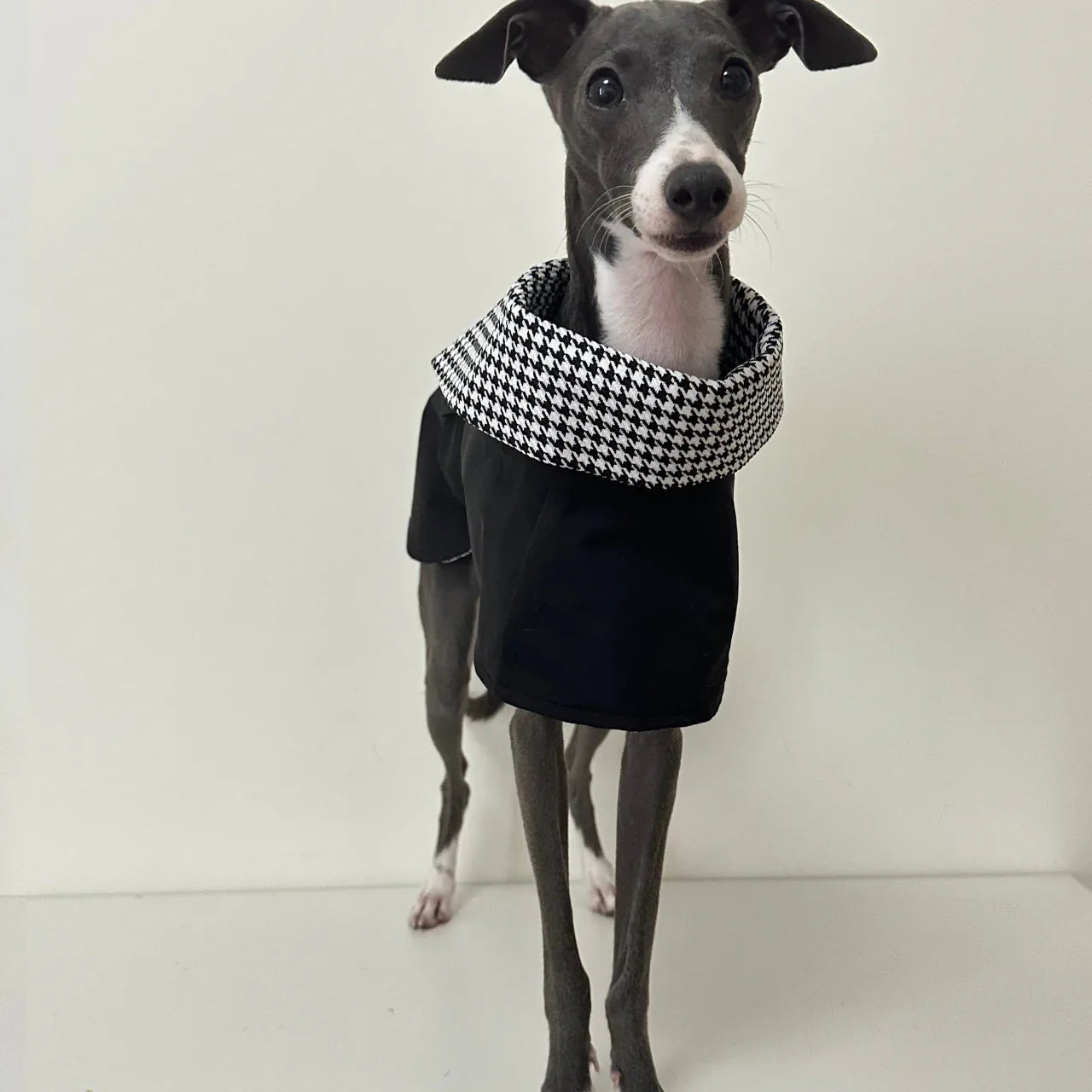 Elevate your pup’s outdoor style with this designer windbreaker coat, tailored exclusively for the elegant build of the Italian Greyhound and Whippet, as well as other small to medium sighthounds. Featuring a bold houndstooth statement collar, this piece blends timeless fashion with modern functionality. The streamlined silhouette is enhanced by an adjustable waist belt, creating a secure, body-contouring fit that complements the deep chest and slim waist of sighthound breeds—no bulk, no slipping, just effortless comfort and style.
