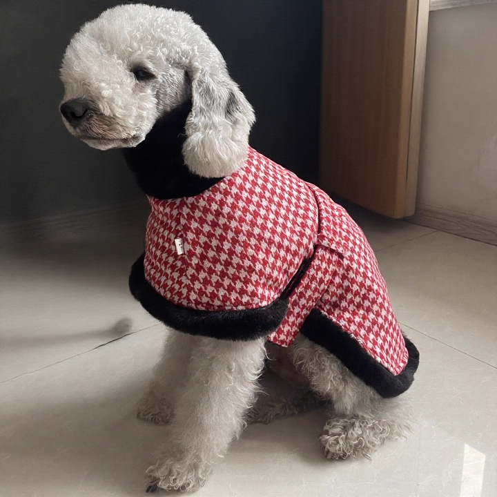 Manténgase abrigado y con estilo con nuestro lujoso abrigo de pata de gallo para perro. Confeccionado en algodón, esta moderna prenda presenta un clásico estampado de pata de gallo en rojo y blanco, con un ribete de suave piel sintética negra. Diseñado para ofrecer comodidad y durabilidad, incluye una correa ajustable para un ajuste seguro y un cuello alto suave para mantener a su peludo amigo abrigado durante los días fríos. Perfecto para paseos al aire libre o ocasiones especiales, este elegante abrigo combina funcionalidad con un estilo atemporal, convirtiéndolo en el complemento ideal para el armario de su mascota.
