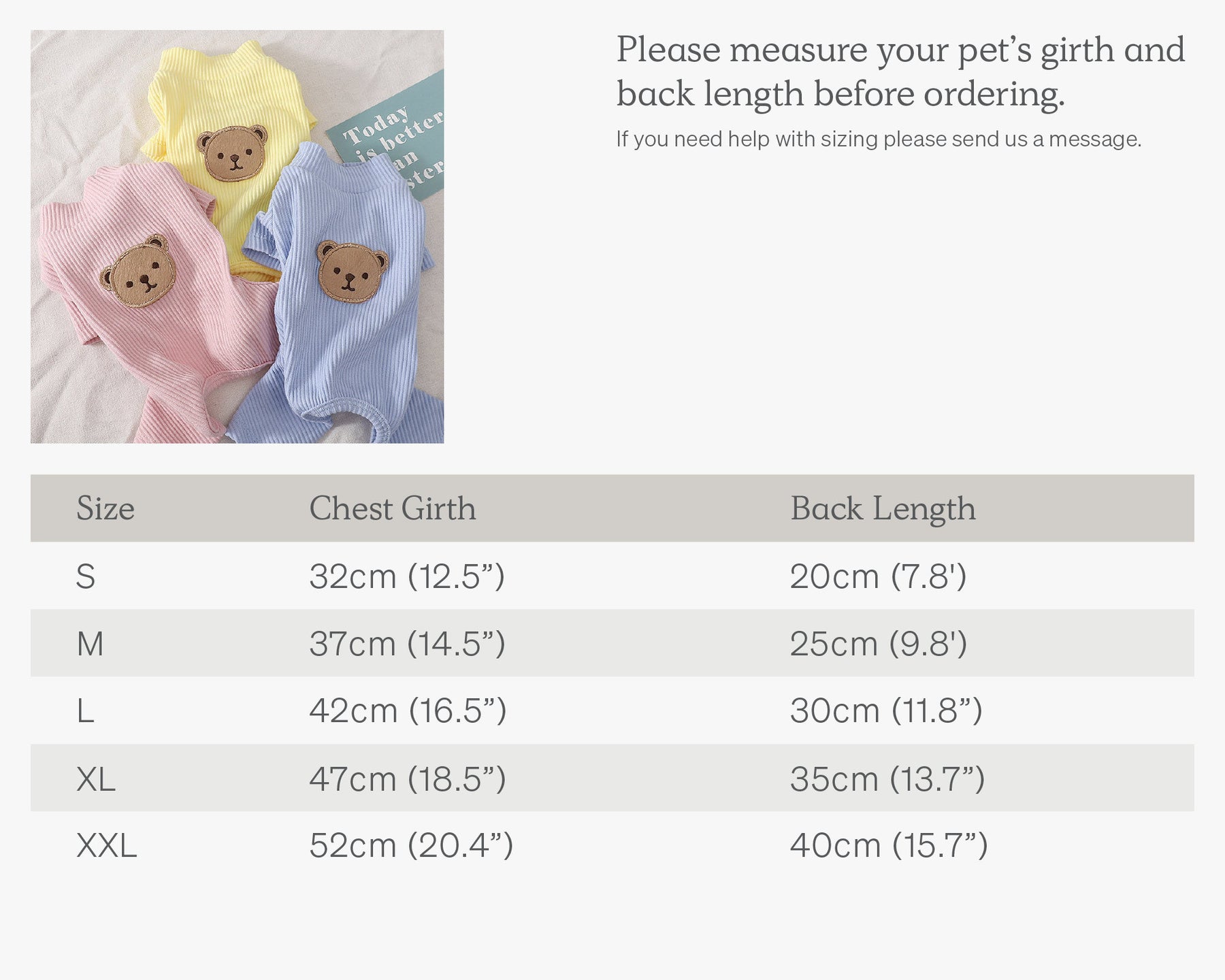 Our adorable bear pet onesies is specially designed for cats and small dogs! These charming pajamas come in three cute and vibrant colors, allowing you to find the perfect style for your furry friend. Made from super comfortable cotton fabric, these onesies ensure maximum coziness for your beloved pet. They are an essential addition to any cat or small dog's wardrobe. Treat your furry companion to both comfort and style with these delightful pet pajamas!
